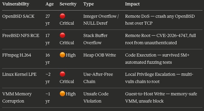 Anthropic's restricted frontier model autonomously discovers zero-days in every major OS and browser, exploits a 17-year-old FreeBSD RCE, and completes a 32-step network attack simulation end-to-end.