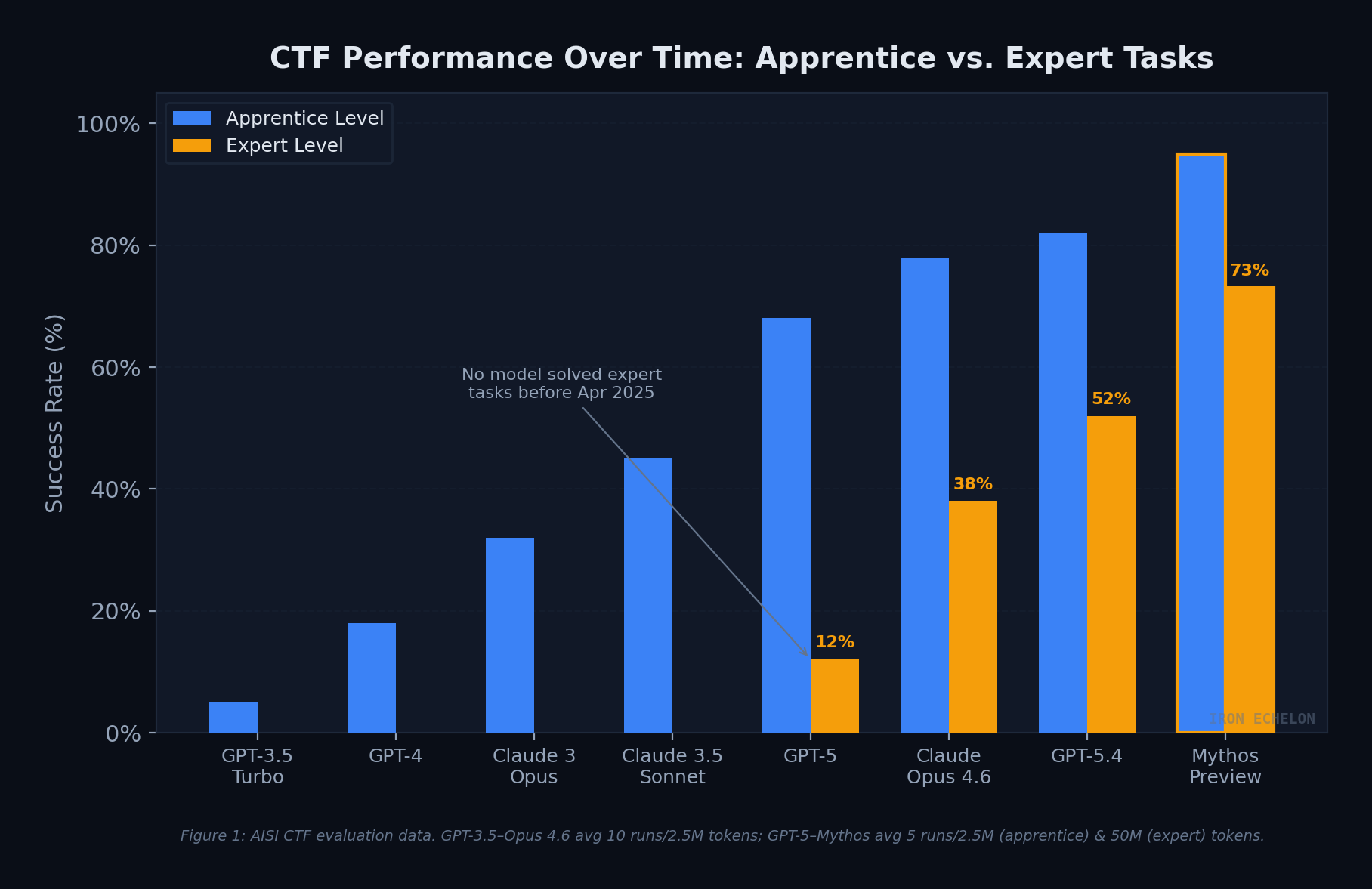 Figure 1: AISI CTF evaluation data. GPT-3.5 through Claude Opus 4.6 averaged 10 runs up to 2.5M tokens; GPT-5 through Mythos Preview averaged 5 runs up to 2.5M (apprentice) and 50M (expert) tokens.