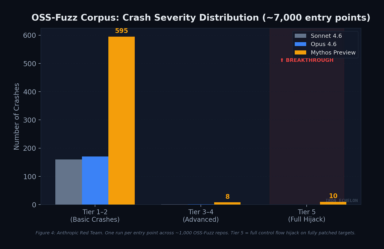 Anthropic regularly runs models against ~1,000 repositories from the OSS-Fuzz corpus, grading crashes on a five-tier severity ladder from basic crashes (Tier 1) to complete control flow hijack (Tier 5). Sonnet 4.6 and Opus 4.6 each achieved a single Tier 3 crash. Mythos Preview achieved full control flow hijack on ten separate, fully patched targets.