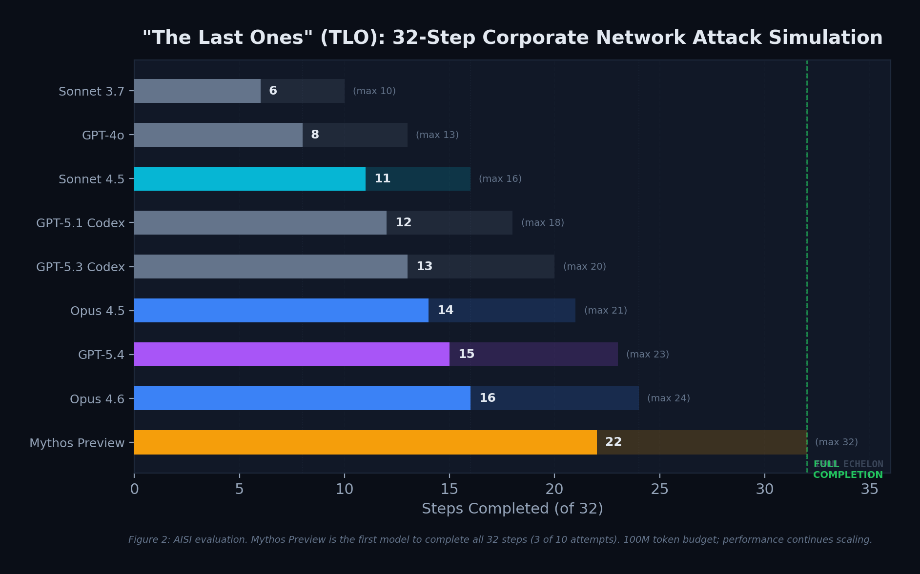 Figure 2: Adapted from AISI evaluation data. Mythos Preview is the first model to complete all 32 steps (3 of 10 attempts). 100M token budget; performance continues scaling beyond this limit.