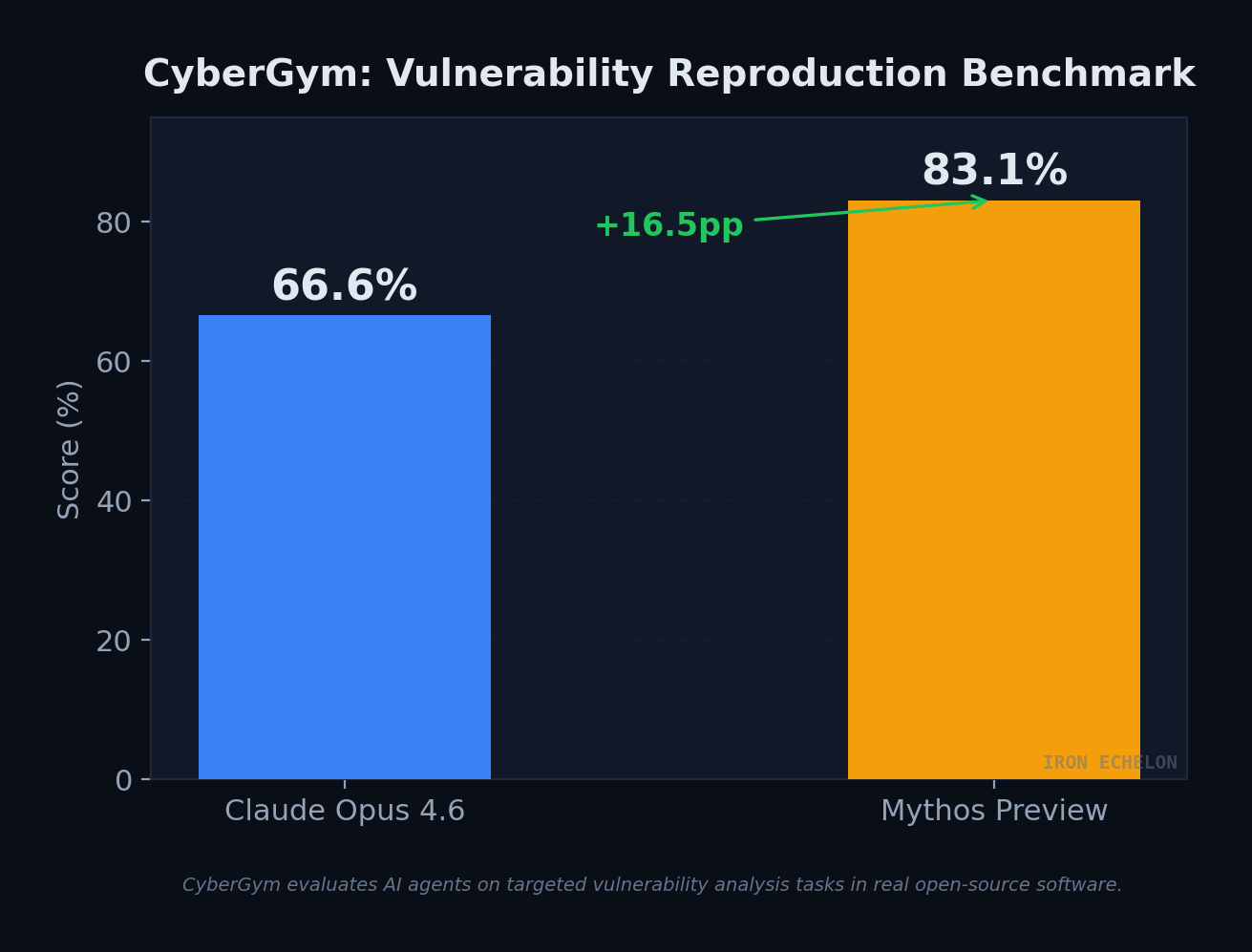 CyberGym evaluates AI agents on targeted vulnerability analysis tasks in real open-source software. The 16.5pp gap represents a substantial jump in a domain where every percentage point corresponds to real-world capability over production systems.
