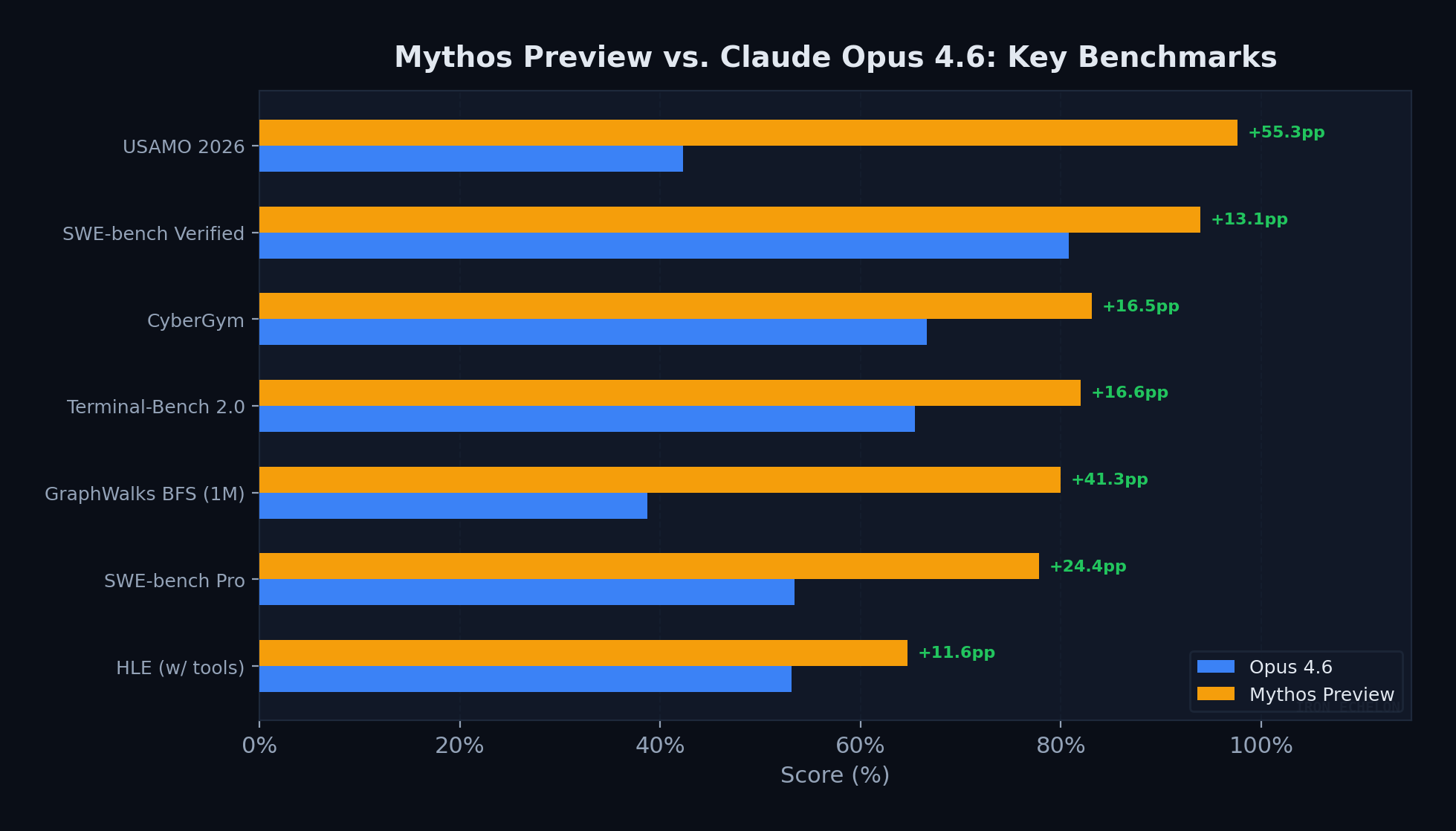 MetricValueCyberGym Score (vulnerability reproduction)83.1% (vs. Opus 4.6’s 66.6%)Expert-Level CTF Solve Rate73% (no model could solve these before Apr 2025)Zero-Day Vulnerabilities DiscoveredThousands (fewer than 1% patched so far)Firefox 147 Working Exploits181 of 250 attempts (vs. Opus 4.6’s 2 of ~500)TLO Cyber Range Full Completion3 of 10 attempts (first model to ever finish)Cybench CTF Benchmark100% pass@1 (fully saturated)
