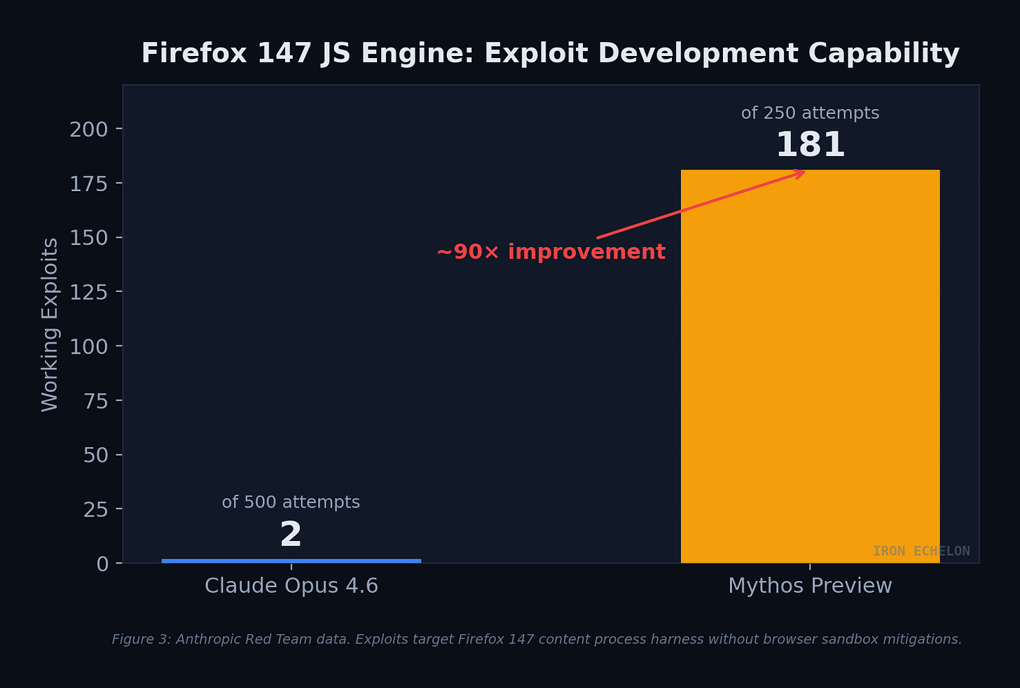 Figure 3: Anthropic Red Team data. Exploits target Firefox 147 content process harness without browser sandbox mitigations. Mythos Preview demonstrates ~90× improvement in exploit development.
