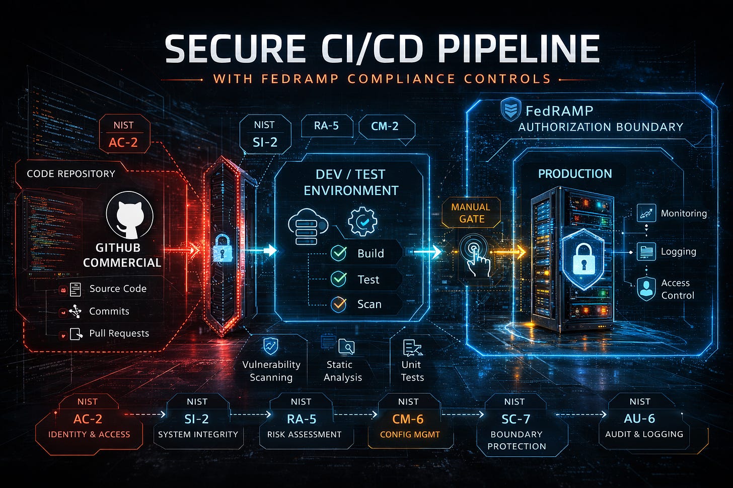 I recently built out a comprehensive control mapping for a CI/CD architecture that a lot of CSPs are running: GitHub Commercial (outside the boundary) → Dev/Test environment (inside the boundary) → Production (inside the boundary, manual promotion gate). Here’s what you actually need to get right.